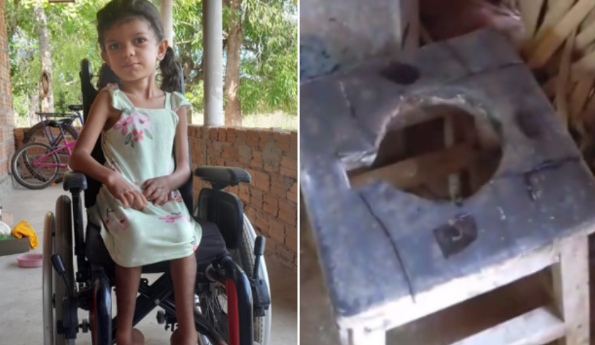 Para que Gaby consiga fazer xixi e cocô, a família encomendou um assento de madeira com um buraco no meio, uma espécie de “penico de madeira”. Não há vaso sanitário adaptado. O banho é tomado sentada em um banquinho, jogando água fria de caneca, no quintal, em um cantinho coberto de palha.