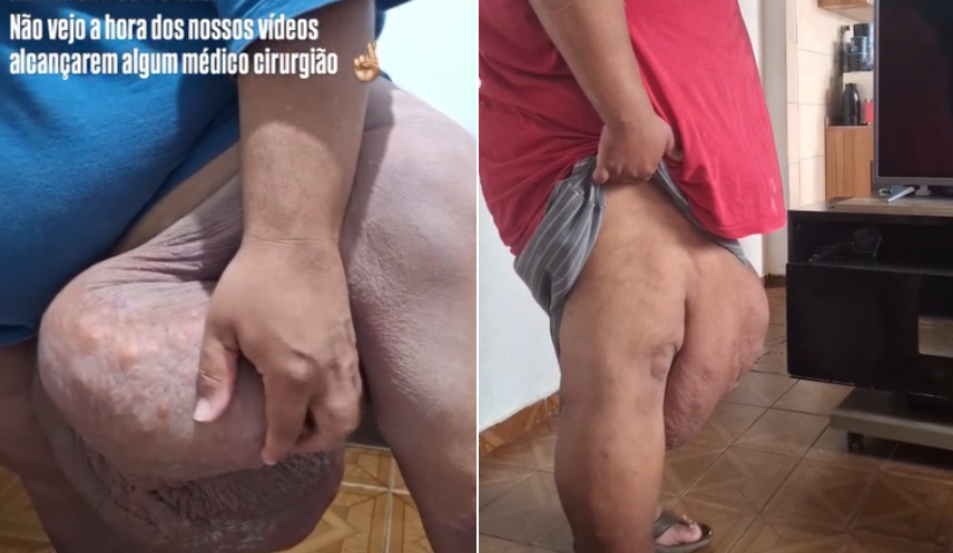 O que muitos pensam ser um tumor é, na verdade, um linfedema severo desenvolvido no sistema linfático, agravado por 12 anos de luta contra a obesidade.
